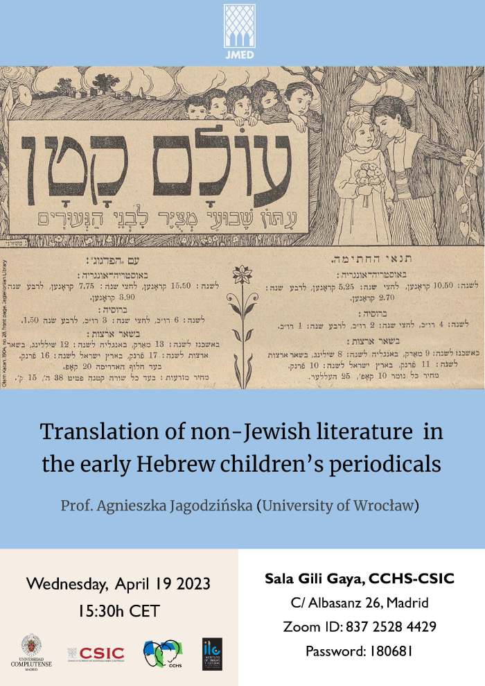 The seminar “Translation of non-Jewish literature in the early Hebrew children’s periodicals”, by Prof. Agnieszka Jagodzińska (University of Wrocław) took place on April 19, 2023, at the Center for Human and Social Sciences (CCHS), in Madrid.